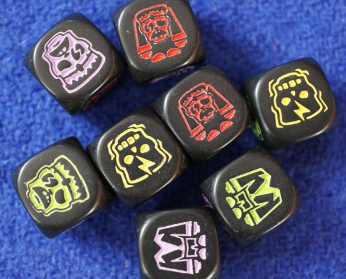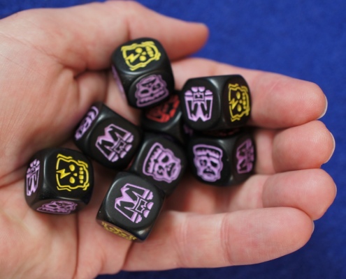 • pójść na całość i odkładać czerwone pokurcze – na koniec tury każda kość z takim wynikiem jest jednokrotnie przerzucana i jeżeli w efekcie uzyskamy ściankę z symbolem czaszki i błyskawicy przynosi nam 2 punkty zwycięstwa (rzuty kończące się ponownie kolejnym czerwonym Frankensteinem mini upoważniają do jeszcze jednego podejścia)