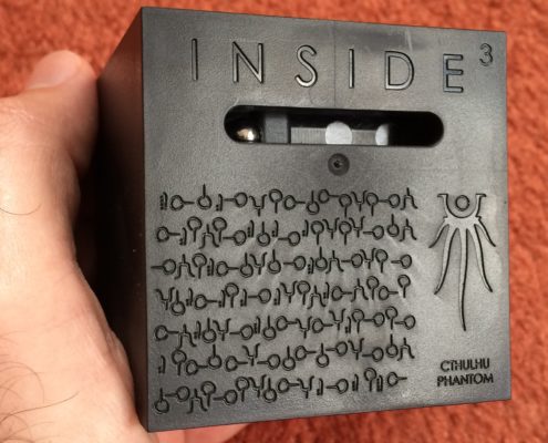 Pewnie na tym etapie niejeden z Was zadał już sobie pytanie „a gdyby tak połączyć powyższe łamigłówki w jedną? Ciekawe co by z tego wyszło?” Nie musicie gdybać, ja to już wiem – wyszłaby ekstremalna kostka Cthulhu (nawiązanie do koszmarnych tworów wyobraźni J.P. Lovecrafta jest całkowicie zamierzone). Wyobraźcie sobie bowiem szczelnie zamknięty, smoliście czarny, sześcienny labirynt, dostarczany bez mapy, za to… z dwiema kulkami!