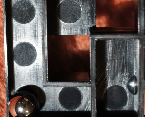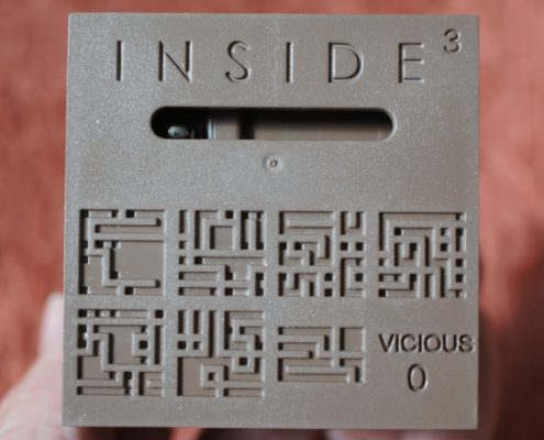Dla purystów ceniących sobie klasyczne wyzwania, pozbawione sadystycznych udziwnień, również znajdzie się coś ciekawego wśród bardziej zaawansowanych łamigłówek Inside³. Jak można utrudnić życie rozwiązującego, wymusić wyższy poziom koncentracji i zniechęcić do nieprzemyślanych ruchów? Wystarczy… uniemożliwić rozebranie łamigłówki! I tak się właśnie stało w modelu Vicious, wydanym w bardzo ładnym odcieniu brązu. Jeżeli tutaj zgubimy gdzieś po drodze kulkę, istnieje niebezpieczeństwo, że już na wieki pozostanie więźniem labiryntu.
